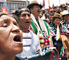 Une mobilisation de paysannes et paysans indiens s’organisa. Parfois, après plus de deux semaines de voyage – en fait, d’expédition – quelque 6000 d’entre eux se rassemblèrent sur la place des Héros à La Paz. Parmi les organisations paysannes «indigénistes», il faut souligner la présence de la puissante Confédération des Peuples de l’Orient (CIDOB). Pedro Numi de la CIDOB insistait non seulement sur la rétrocession des terres aux peuples indigènes, mais aussi «sur la garantie de l’accès à l’éducation, à la santé et à la technologie agricole».