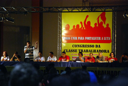 Dans les diverses thèses présentées, on pouvait repérer des convergences et des divergences importantes [5]. Cela portait sur le fonctionnement de la future centrale syndicale, sur les règles de représentation proportionnelle des courants, sur l’intégration des courants au sein d’une direction et les pouvoirs donnés à cette direction. La même chose peut être dite pour ce qui a trait à l’analyse de la conjoncture nationale: il existait une «tension en arrière-fond» liée à la campagne électorale pour la présidentielle d’octobre. Durant le congrès, la polarisation se fit de manière évidente entre ceux qui optaient pour la candidature de Ze Maria (Parti socialiste unifié des travailleurs – PSTU) et ceux qui soutenaient la candidature de Plinio de Arruda Sampaio (Parti du Socialisme et de la Liberté – PSOL), comme deux chemins différents pour traduire la lutte et les intérêts des travailleurs contre les deux partis de l’ordre bourgeois (PSDB et PT). Le rejet mutuel de la «responsabilité» concernant la non-concrétisation du Front de Gauche fut une constante durant le congrès ; une candidature placée sous le signe du Front de Gauche aurait permis de modifier quelque peu le système de centre gauche / centre droit que Ricardo Antunes présente, dans Correio da Cidadania, comme un danger «d'américanisation» du système politique brésilien actuel.