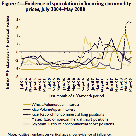 Dans un rapport publié en 2009, un institut de recherche américain, l'IFPRI, s'est employé à mesurer l'effet de la spéculation sur les cours à la bourse de Chicago, à partir d'indicateurs précis, comme les volumes de contrats à terme (la spéculation augmente les volumes), ou encore le rapport entre les positions «commerciales» et «non commerciales» (les positions «non commerciales» étant celles des spéculateurs). Leur bilan, résumé dans le graphique ci-dessous, est mitigé: «Les activités spéculatives pourraient avoir influencé les cours», ajoutant avoir trouvé des preuves de causalité indiscutables sur certaines périodes.