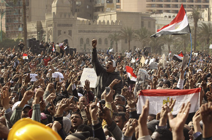 Les deux principales confessions du pays, l’islam et le christianisme, sont aussi ostensiblement représentées ici. Les oulémas azharites, avec leur turban blanc enroulé autour de leurs taqia rouges, lèvent vers le ciel le même poing énergique que quelques ecclésiastiques coptes avec leur énorme croix pendant sur leur soutane. Une banderole résume «l’unité interconfessionnelle contre le despotisme»: «Les cheikhs et les qissis (prêtres) contre le raïs (le président)».