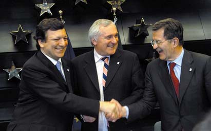 Passage de témoin à la Commission européenne: à gauche le libéral (PSD portugais) Barroso, à droite le libéral-social Prodi, espoir de la gauche italienne