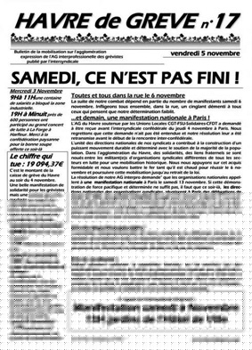 Nous reproduisons ci-dessous l’Appel national de l’AG Interprofessionnelle du Havre adopté à l’occasion de la journée de mobilisation du samedi 6 novembre. Il est publié dans le No. 16 de la publication Le Havre de grève.