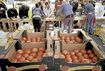 Vente organisee par le Modef, syndicat agricole d'exploitants familiaux, avec l'aide de militants du Parti Communiste (PCF), proposant des produits a des prix inferieurs à ceux du marche.