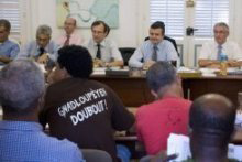 Elie Domota (de dos), lors des premières négociations face à Yves Gégo (deuxième, en face, depuis la droite)
