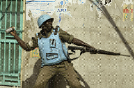 Un casque bleu de l'ONU défend la démocratie à Haïti, avec une bombe lacrymogène