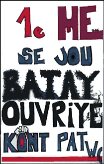 En donnant toujours la priorité aux intérêts des travailleurs, nous, du Camp du peuple, réaliserons ensemble la construction nécessaire. Dans Batay Ouvriye nous travaillons dans ce sens. Notre pratique face à la catastrophe doit nous conduire ensemble sur la scène politique. De même, nos pratiques face à la catastrophe doivent s'intégrer dans celles que nous avons toujours eues, alors qu'elles-mêmes doivent surgir à nouveau: il s'agit d'un double mouvement, et c'est la seule manière d'envahir cette scène politique de manière réellement autonome. Il s'agit de prendre l'ennemi dans un mouvement de tenaille.