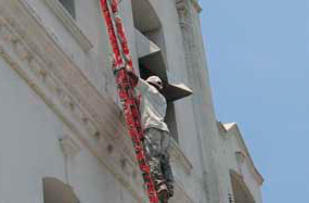 Une famille haïtienne et un peintre au travail... sur la façade du Palais présidentiel