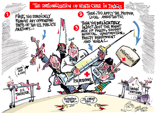 Dans un rapport très critique, CorpWatch éreinte la reconstruction des infrastructures médicales irakiennes par les entreprises américaines. Ces entreprises, parmi lesquelles Parsons Global, Abt Associates et Bechtel, n’ont guère fait plus que ramasser des tas d’argent avant de… plier bagages.[39] Elles avaient décroché d’énormes contrats pour la reconstruction: 70 millions de dollars pour Parsons, 43 millions pour Abt et 50 millions pour Bechtel. Ici, des institutions des Nations unies aussi expérimentées que l’Unicef et l’Organisation mondiale de la santé avaient été évincées.