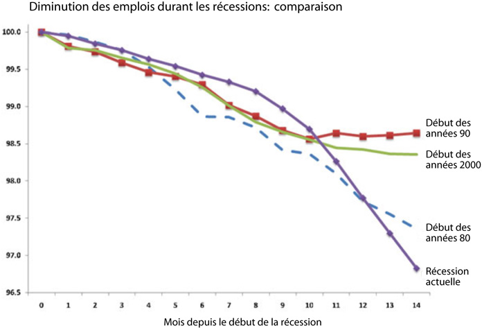 Un graphique (voir ci-dessous) a été établi par l’Economic Policy Institute. Il traduit bien l’ampleur du processus de contraction de l’emploi et surtout son accentuation en cours depuis septembre 2008 (voir: Récession actuelle); cela en comparaison avec l’évolution du recul de l’emploi à l’occasion des récessions antérieures.