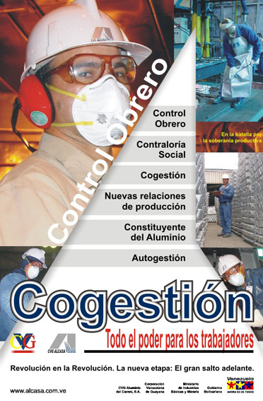 Dans l’immense manufacture d’aluminium ALCASA qui est propriété de l’Etat et où l’expérience la plus avant-gardiste de ce que l’on appelle "la cogestion" est mise en place. Il est assez clair que pour les travailleurs le mot "cogestion" signifie précisément le contrôle et le management par les travailleurs. De ce fait, une affiche imprimée par ALCASA met en avant le "contrôle ouvrier" comme slogan principal (voir l'illustration ci-dessus).