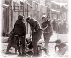 Le soldat attrape le type et le force à se retourner: il lui envoie un coup de pied dans les testicules. Il s'apprête à recommencer et il m'aperçoit. Il s'arrête. À nouveau, le Palestinien doit se retourner, les jambes bien droites. Le soldat lui envoie un coup de pied dans la pliure du genou et un suivant dans les fesses, pour lui apprendre à se tenir droit sous les coups, sans doute ! Je vous rappelle que les glorieux soldats de Tsahal ne portent pas de charentaises...
