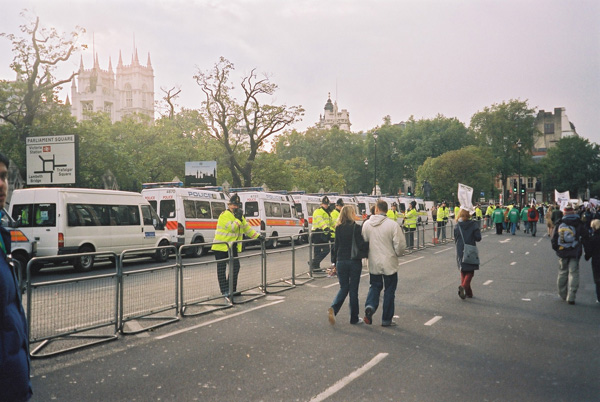 Manifestation "à l'anglaise", entrecoupée d'immenses espaces vides; tactique policière, paraît-il.