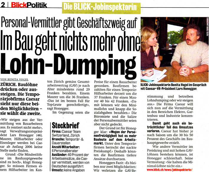 Qu'en pensent les syndicalistes qui prétendent que le OUI asurera «la libre circulation avec des salaires suisses» ? Et les signataires de l'appel "abattre tous les murs", qui prétendent demain améliorer des mesures d'accompagnement «largement insufisantes» et qui comme Jacques ROBERT, secrétaire central UNIA, se révèlent incapables d'empêcher aujourd'hui les pratiques mises en évidence par cet article du Blick (7 juillet 2005) ?