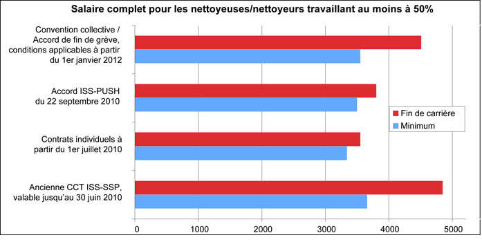 À l’issue du conflit, les salaires évolueront entre 3550 et 4510 francs à partir de 2012 (voir graphique ci-dessous). Le critère de l’âge disparaît avec la nouvelle grille salariale tandis que reste celui de l’ancienneté. Quant au personnel travaillant moins de 50%, le salaire minimal horaire augmentera de 20,50 à 21 francs lors de l’engagement pour ensuite passer à 21,80 à partir de la 3e année et à 22,60 à partir de la 5e.