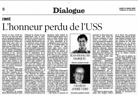 Etre loyal à la décision majoritaire d’un Congrès, n’est-ce pas le devoir d’un permanent syndical ? Non, répond, de fait, Serge Gaillard. Pourquoi ? Parce que, comme il l’a confié à l’ancien président du PSS Peter Bodenmann, lors du dernier congrès du Parti socialiste: « Le licenciement de R. Molo est le prix que l’on doit payer pour être considérés comme de vrais partenaires par le Conseil fédéral et les milieux économiques. »