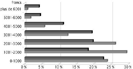 (% des femmes -gris foncé- et des hommes -gris clair- par classe de salaire mensuel net, 1996)