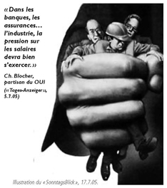 Le grand entrepreneur et conseiller fédéral Christoph Blocher, qui milite en faveur du OUI, déclare: « Dans certaines branches, comme dans le secteur des banques et des assurances, de l’ingénierie ou dans l’industrie, la pression sur les salaires devra bien s’exercer ». (Tages-Anzeiger, 5.7.05)