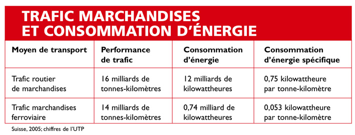 Dans la publication des CFF, Via, N° 3/2008, un article est consacré à une comparaison entre le transport routier de marchandises et le trafic marchandises ferroviaire. L’article commence par une affirmation claire et nette: «Les transports publics (TP) ont généralement la réputation d’être plus compatibles avec l’environnement que le trafic motorisé individuel. Une des caractéristiques de chacun des modes de transport montre que cette perception est effectivement juste: comparés à leurs performances, les TP (route et rail) consomment quatre fois moins d’énergie et émettent onze fois moins de gaz carbonique… Même si la politique a son mot à dire [!] pour décider ce qui peut être écologique, il est indéniable que les transports publics sont nettement les meilleurs au niveau de la compatibilité écologique», assure Hans Kaspar Schiesser, expert du trafic de l’Union des transports publics (UTP). Nous reproduisons ci-dessous le tableau comparatif concernant le trafic marchandises (Via, p. 68).