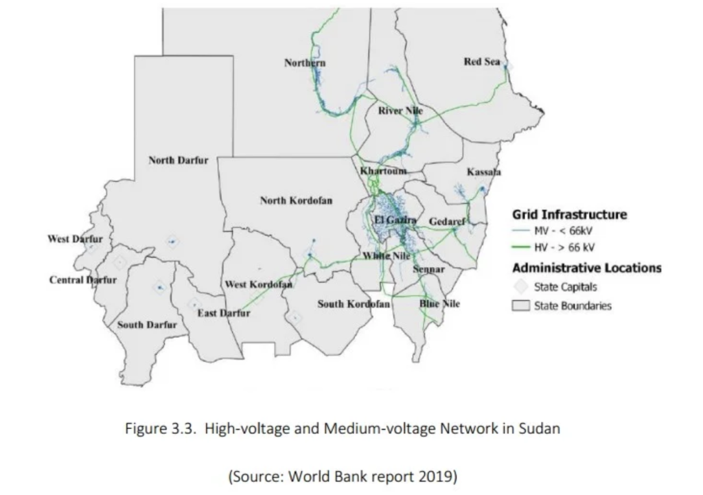 Cette configuration n’est pas propre au réseau électrique, mais s’étend à toutes les infrastructures de services publics, de la santé et l’éducation aux télécommunications et aux banques. On observe le même schéma dans la répartition des activités économiques productives, avec plus de 70% des grandes installations industrielles du Soudan concentrées dans la capitale, Khartoum, et dans l’Etat de Gezira.