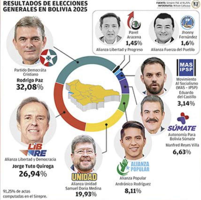 L’ancien président Jorge «Tuto» Quiroga, membre actif du groupe international de droite Liberté et Démocratie, qui comprend José María Aznar [Etat espagnol, PPE] et Iván Duque [président de Colombie de 2018 à 2022], entre autres anciens présidents néolibéraux hispano-américains, est arrivé en deuxième position. Quiroga a obtenu 27,3% des voix, ce qui lui a suffi pour se qualifier pour le second tour.