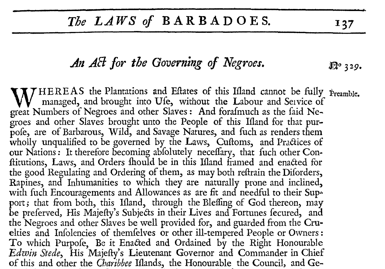 Sur l’île caribéenne de la Barbade, la loi britannique de 1688, intitulée «Pour le gouvernement des Nègres», a proclamé que «les Nègres […] sont de nature barbare, sauvage et féroce, et qu’ils sont donc totalement inaptes à être gouvernés par les lois, coutumes et pratiques de notre nation. Il devient donc absolument nécessaire que d’autres constitutions, lois et ordonnances soient élaborées et promulguées pour bien les réguler ou les ordonner, afin de limiter les désordres, les rapines et les inhumanités auxquels ils sont naturellement enclins.»