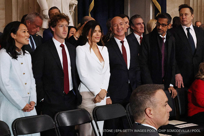 Mais au moins 17 milliardaires, dont la fortune cumulée dépasse les 1000 milliards de dollars, ont réclamé des places convoitées dans la rotonde du Capitole – une concentration historique de richesse qui semblait annoncer l’avènement d’une nouvelle classe d’oligarques états-uniens, venus célébrer un président connu pour récompenser publiquement ses alliés et punir ses adversaires.