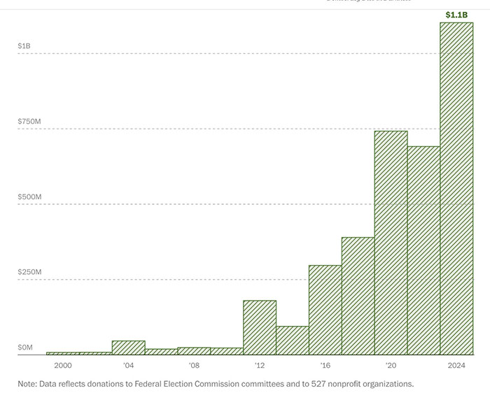 En 2000, les 100 personnes les plus riches du pays ont donné environ un quart de 1% du coût total des élections fédérales, selon une analyse du Washington Post basée sur les données d’OpenSecrets. En 2024, ils couvriront environ 7,5%, alors même que le coût de ces élections a grimpé en flèche. En d’autres termes, environ 1 dollar sur 13 dépensé lors des élections nationales de l’année dernière a été donné par une poignée de personnes parmi les plus riches du pays.