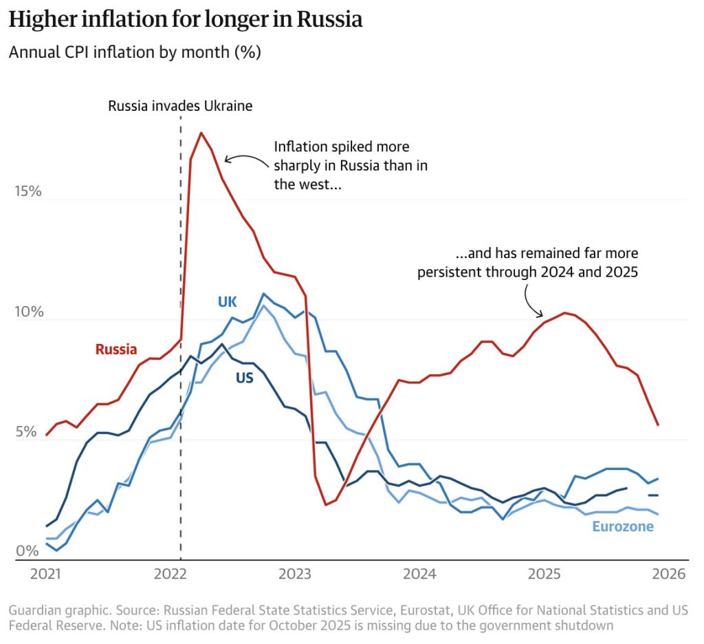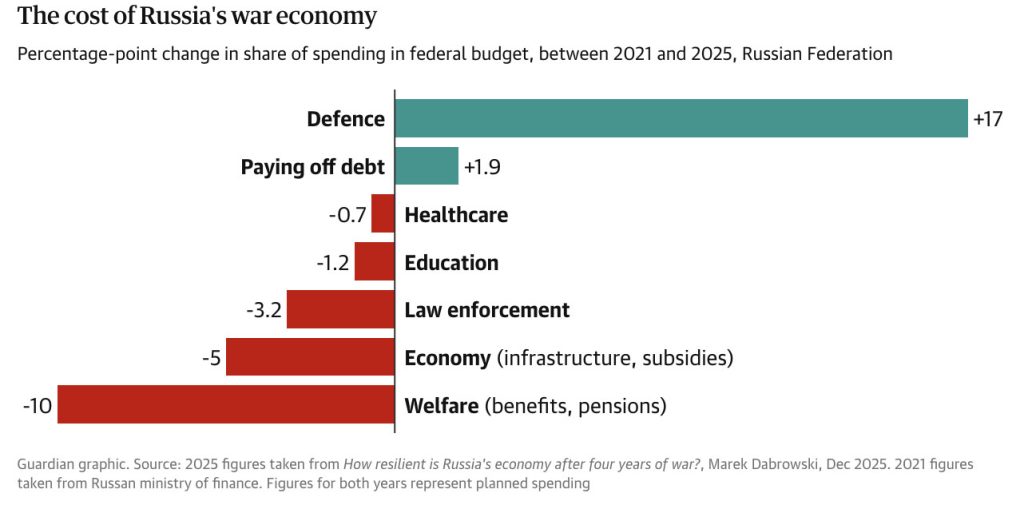 Mais ces dernières semaines, certains éléments indiquent que le Kremlin a changé d’avis. La Russie a accepté de participer à des pourparlers de paix avec l’Ukraine pour la première fois depuis des mois, les réunions menées par les États-Unis se déroulant cette semaine à Abu Dhabi. Pour les négociateurs ukrainiens, un facteur clé entre désormais en jeu: l’économie de guerre russe montre des signes de faiblesse et ne peut durer éternellement. (Article publié par The Guardian le 6 février 2026; traduction rédaction A l’Encontre)