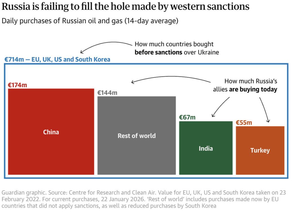 Mais les sanctions occidentales jouent également un rôle, malgré les efforts de la Russie pour trouver de nouveaux acheteurs. La Chine, l’Inde et, dans une moindre mesure, la Turquie ont toutes augmenté leurs achats à la suite de l’invasion, alors que les exportations vers l’Europe ont fortement chuté. Mais en 2026, leurs activités combinées sont insignifiantes par rapport aux achats effectués à la veille de la guerre par les pays qui ont imposé des sanctions.