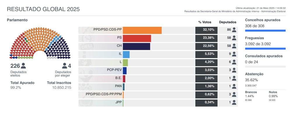 Les Açores restent la circonscription électorale avec le taux d’abstention le plus élevé aux élections législatives: 56,19 % des électeurs ne se sont pas rendus aux urnes. Braga est quant à elle la circonscription avec le taux d’abstention le plus faible: 30,29 %. En termes de concelhos, Ribeira Grande a été le concelho le plus abstentionniste, avec 62,34%. Le Sardoal, à Santarém, a été le concelho avec le taux d’abstention le plus faible: 26,95 %. (Article publié par le quotidien Publico le 19 mai 2025; traduction rédaction A l’Encontre)