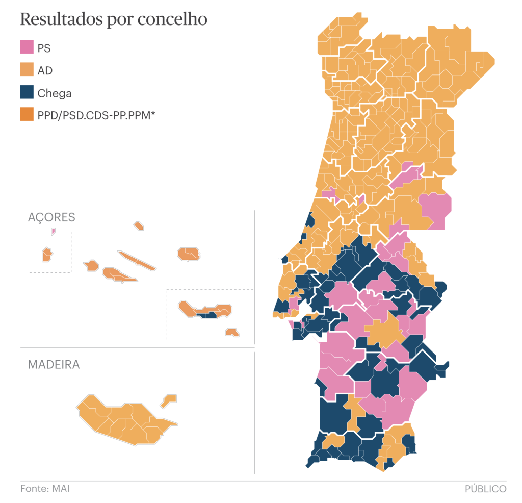Si, en 2024, le PS était le parti le plus voté dans 140 communes/municipalités [concelhos: subdivision des districts/circonscriptions électorales: au nombre de 22], le dimanche 21 mai ce chiffre est tombé à 33. En plus d’avoir perdu la première place dans 107 concelhos (dont 58 sont passées à l’AD et 49 à Chega) du nord au sud du pays, dans 60 concelhos les socialistes n’ont même pas atteint 20% des voix, ce qui, sur un total de 308 concelhos, équivaut à environ un cinquième du pays. Dans les circonscriptions de Beja et Setúbal, le PS n’avait pas perdu depuis 1991.