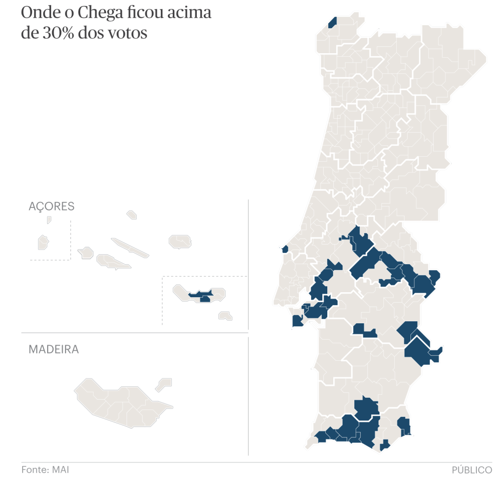 Avec la progression de Chega de 18,06% à 22,56% des voix sur l’ensemble du territoire national, le nombre de concelhos dans lesquelles le parti a obtenu plus de 30% des voix a également augmenté (avec notamment la circonscription de Faro, où dix concelhos ont dépassé la barre des 30%, comme Vila Real de Santo António, Portimão et Albufeira). Au total, Chega a obtenu plus de 30% des voix dans 37 concelhos.
