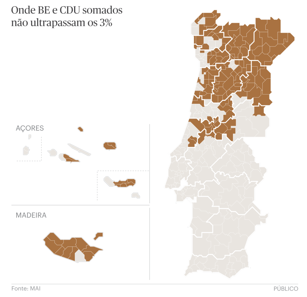 Dans le nord et le centre, on observe une prédominance significative des concelhos où le total des votes du BE et de la CDU ne dépasse pas 3% du total des votes enregistrés. Cette tendance met en évidence la faible implantation électorale de ces forces politiques dans ces régions, contrairement au sud du pays, où, bien que Chega ait progressé en termes de votes, le BE et la CDU restent au-dessus de leur moyenne nationale.