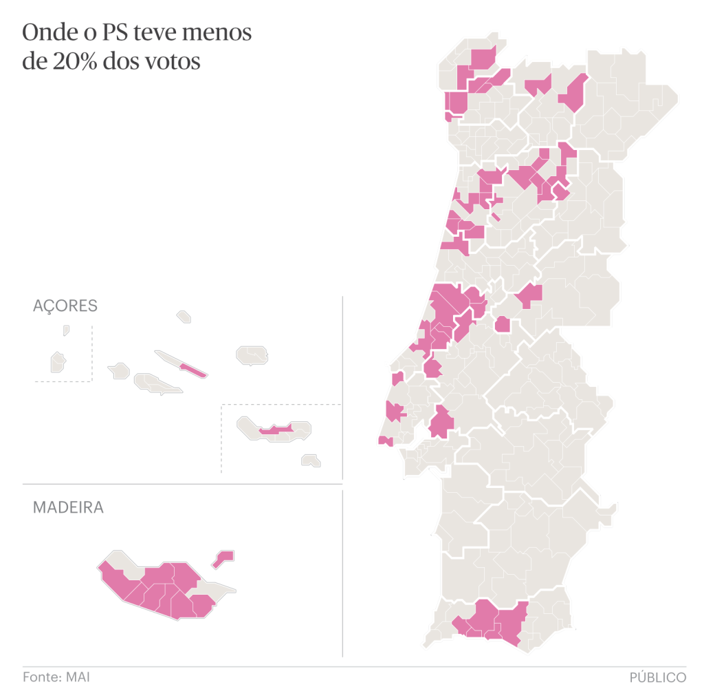 Le pire résultat du PS a été enregistré dans le concelho de Calheta, dans circonscription de Madère, où les socialistes ont obtenu seulement 7,7% des voix. La Calheta était déjà le concelho où le PS avait obtenu son pire résultat en 2024, mais cette année il a perdu encore plus de voix, tandis que Chega est passé de 9,3% à 17% des voix. Ce n’est que dans les circonscriptions de Bragança, Portalegre, Evora, Beja et Setúbal que le PS a réussi à obtenir plus de 20% des voix dans au moins un concelho.