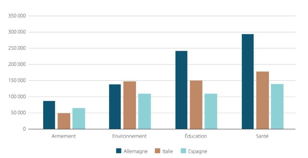 Lecture : en Allemagne, un même montant de dépenses publiques a créé 86 000 emplois dans l’armement contre 292 000 dans la santé entre 2013 et 2023.