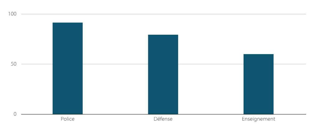 En réalité, les données budgétaires de longue période n’indiquent aucunement une diminution des dépenses militaires15. Entre 2000 et 2023, non seulement ces dépenses n’ont pas été maltraitées, mais elles ont connu une forte progression, certes inférieure à celles de la police (+92%) mais nettement plus élevée que les dépenses d’enseignement (+60%) (graphique 3)16.