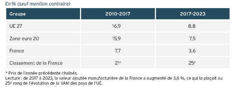 D’autres raisons rendent délicat ce rattrapage du retard. D’une part, les difficultés des grands groupes avec leur chaîne de sous-traitants pour augmenter les cadences de production sont une conséquence directe de la perte de densité industrielle du territoire national, même si les difficultés d’approvisionnement liées à la fragmentation géopolitique de l’économie mondiale jouent également un rôle (Serfati, 2022). En effet, le processus de désindustrialisation qui touche la France depuis la fin des années 1990 est à peine freiné depuis 2017. Entre 2000 et 2021, les activités manufacturières ont perdu 22% des emplois, soit près de 900 000 emplois (Guillou, 2024). La période suivante n’a guère été meilleure puisqu’à la fin de l’année 2024, le niveau de la production industrielle en France était encore inférieur de 8% à celui qui précédait la crise sanitaire de 2020. Certes, le gouvernement annonce que 100 000 emplois industriels ont été créés entre 2017 et 2024. Néanmoins, ces performances maintiennent la France en queue de la liste des pays de l’UE. Pire, alors que du point de vue de l’évolution de la valeur ajoutée créée par l’industrie manufacturière (VAM) entre 2010 et 2017, la France figurait à la 21e place (sur 27 pays membres de l’UE), cette position s’est encore détériorée entre 2017 et 2023. Au cours de cette période, la France a rétrogradé à la 25e place, la croissance de sa VAM ayant été deux fois plus faible que celle de la moyenne des autres pays de l’UE (tableau 2).