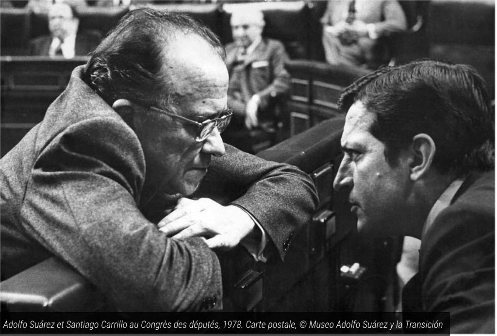 En réalité, le terme «transaction» explique mieux que ceux de «réforme imposée» par la dictature elle-même ou de «rupture négociée» avec celle-ci, ce qui s’est passé entre 1975, année de la mort de Franco, et 1978, année de l’adoption de la Constitution [en 1977 a été adoptée la loi d’amnistie-Ley de Amnistía]. De manière cynique, Santiago Carrillo, alors secrétaire général du PCE, a inventé la formule «amnistie en échange d’amnésie».[3]