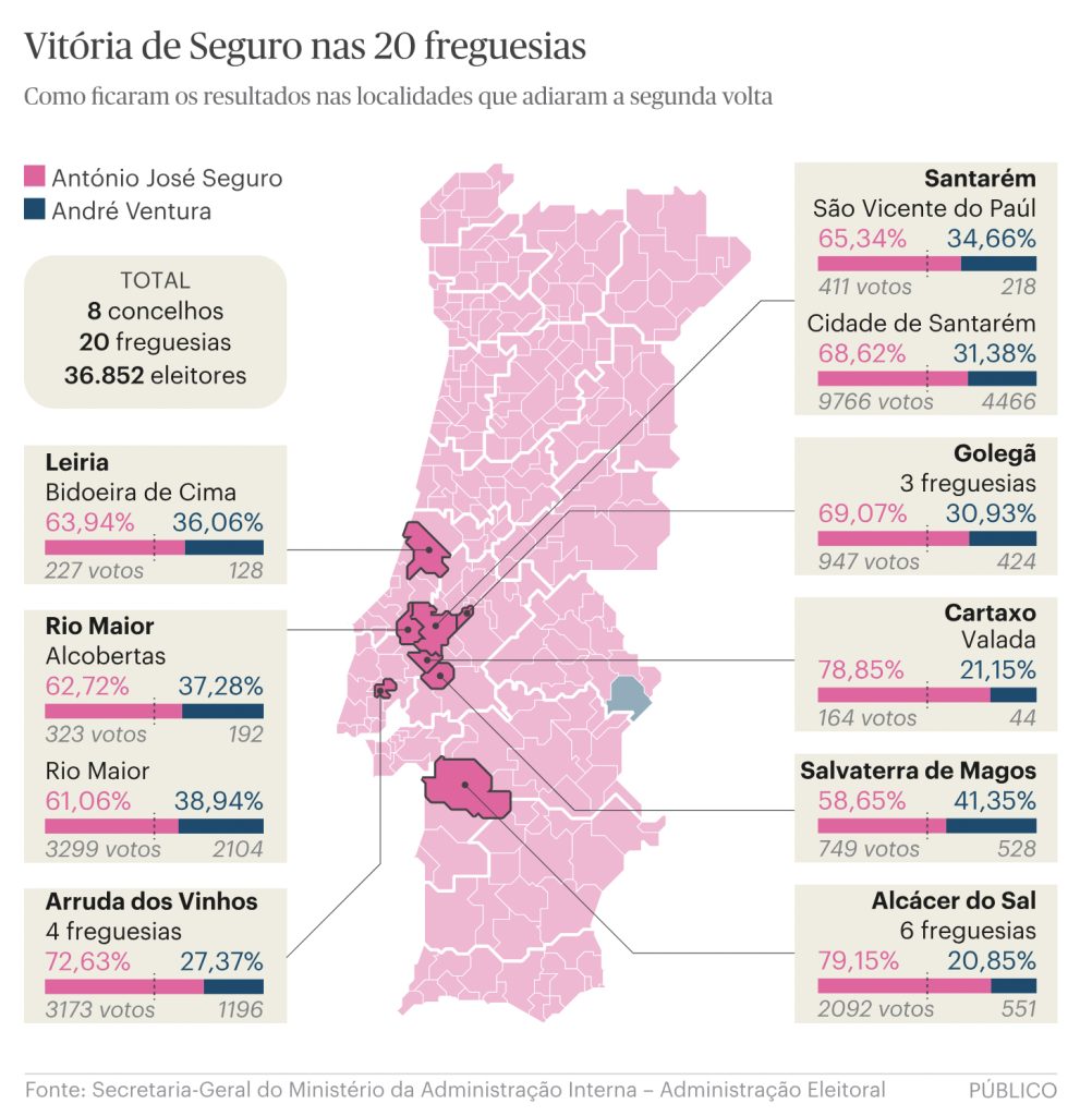 [1] La tempête qui a frappé des régions du Portugal (vents violents et fortes pluies) a abouti à un report du second tour des élections présidentielles dans huit circonscriptions, qui s’est tenu le 15 février. António José Seguro a obtenu un résultat supérieur au pourcentage national dans quatre circonscriptions: Alcacer do Sal, Arruda dos Vinhos, Golega et Leira (voir graphique ci-dessous tiré du site du quotidien Publico en date du 15 février 2026). Ces résultats partiaux modifient tout à fait à la marge le résultat national final: 66,83% pour Seguro (3,48 millions de voix), 33,17% pour Ventura (1,73 million).