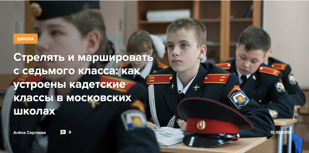 Au début des années 1990, certaines de ces écoles ont fermé, mais de nouvelles ont progressivement vu le jour, souvent créées par les autorités locales, des officiers militaires à la retraite ou en activité et des membres des services de sécurité. A la fin des années 1990, leur nombre était passé à 40. Parallèlement, des écoles et des classes de cadets ont commencé à apparaître dans les écoles publiques traditionnelles, un modèle qui n’existait pas en Union soviétique. Ces élèves portent également des uniformes, suivent une discipline stricte et participent à des exercices militaires après avoir terminé leurs cours normaux. Une journée scolaire pour un élève d’une classe de cadets commence généralement par l’appel à 8 heures et se termine à 18 heures. Les classes sont organisées en «pelotons», eux-mêmes divisés en «sections» dirigées par des «commandants». L’après-midi, les élèves suivent des cours d’histoire et de service armé dispensés par un instructeur militaire, ainsi qu’une formation au maniement des armes et au tir. Ils rejoignent également des clubs consacrés à des thèmes militaires et civiques. Les expositions patriotiques, les excursions, les bals militaires et les défilés sont monnaie courante. En plus d’un professeur principal, chaque classe dispose généralement d’un administrateur affilié à l’armée.