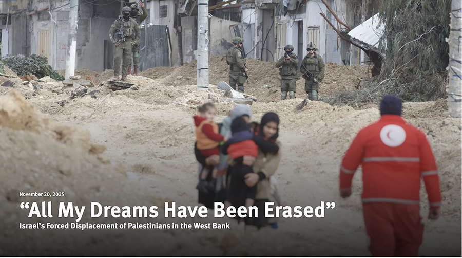 Ce rapport de 105 pages, intitulé « ‘All My Dreams Have Been Erased’: Israel’s Forced Displacement of Palestinians in the West Bank » (« ‘Tous mes rêves ont été effacés’ : Déplacement forcé par Israël de Palestiniens en Cisjordanie »), détaille l’« Opération Mur de fer » (« Operation Iron Wall »), une opération militaire israélienne touchant les camps de réfugiés de Jénine, Tulkarem et Nour Chams, qui a commencé le 21 janvier 2025, quelques jours après l’annonce d’un cessez-le-feu temporaire à Gaza. Les forces israéliennes ont abruptement ordonné aux civils de quitter leur domicile, notamment à travers des haut-parleurs montés sur des drones. Des témoins ont déclaré que les soldats quadrillaient les camps en faisant brutalement irruption dans les domiciles, en saccageant les propriétés, en interrogeant les habitants et finalement en forçant toutes les familles à partir.
