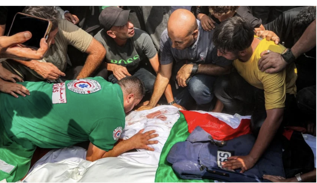 Ci-dessous, des journalistes palestiniens rendent hommage à leurs collègues assassinés.