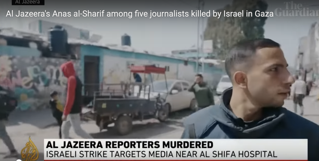 Dimanche, Israël a délibérément tué six journalistes palestiniens qui se trouvaient dans une tente de presse installée à l’extérieur de l’hôpital al-Shifa à Gaza. Ils s’appelaient Anas al-Sharif, Mohammed Qreiqeh, Ibrahim Zaher, Mohammed Noufal, Moamen Aliwa et Mohammed al-Khalidi.