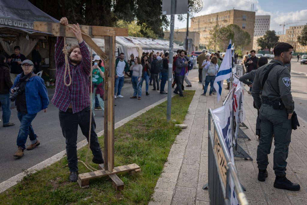 Des militants manifestent contre la loi sur la peine de mort devant la Knesset, à Jérusalem, le 31 mars 2026. (Chaim Goldberg/Flash90)