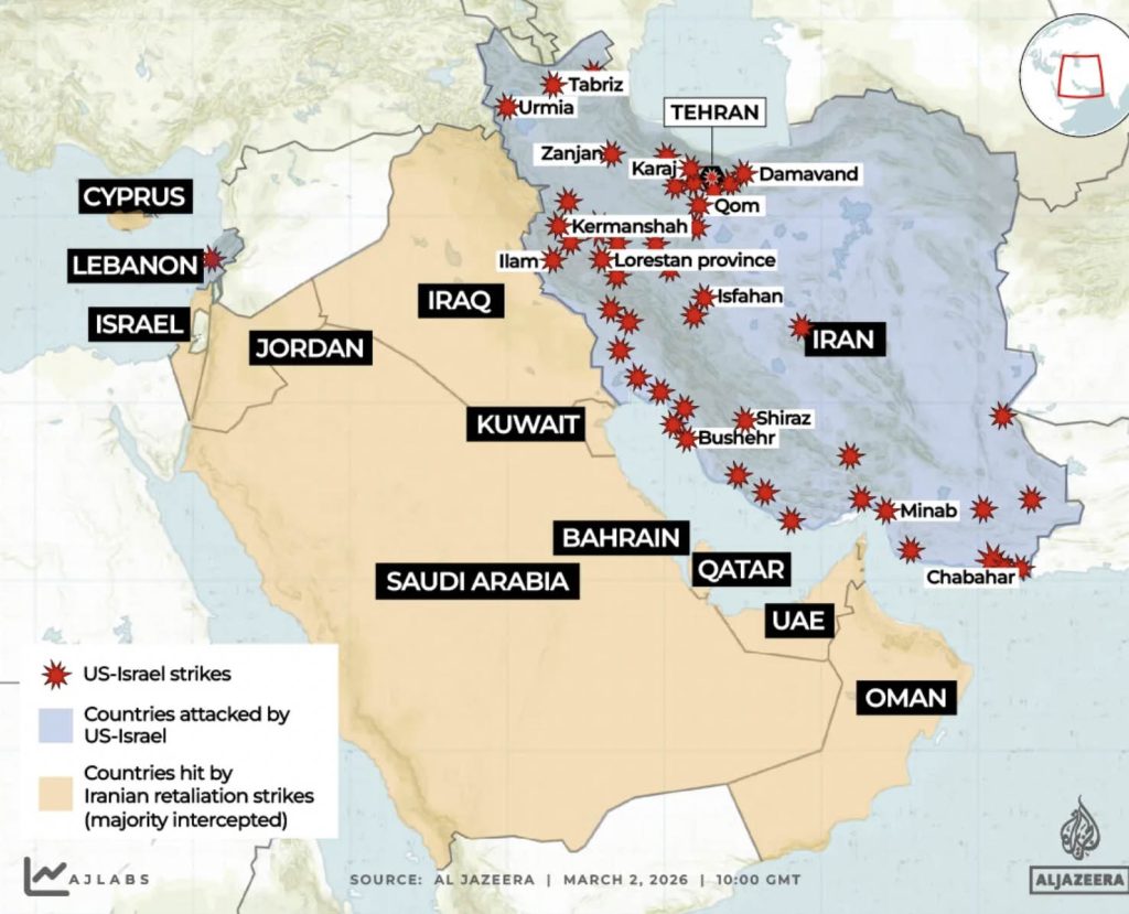 Carte d’Al Jazeera, 2 mars 2026.